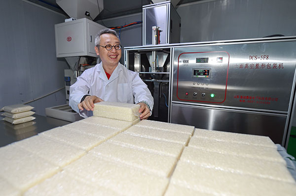 8月29日,一名來自北京的客戶在稻米加工車間體驗包裝環節。