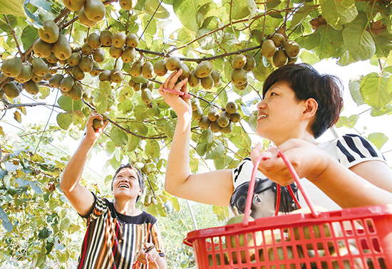 又到獼猴桃採摘時節。前日,甘霖鎮黃勝堂村大猴山家庭農場內,遊客們正在採摘獼猴桃。