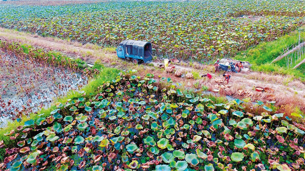 9月5日,在海口桂林洋經濟開發區邁德村,農民們正忙著搶收蓮藕。今年的秋藕收成不錯,價格也比較穩定,目前的收購價格在2元至3元一斤。