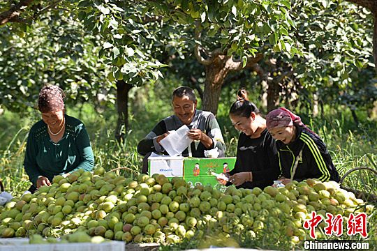 9月5日上午,在新疆庫爾勒市沙依東園藝場果農阿不力坎木·斯麻衣果園里,採摘工巴哈爾古麗正在採摘香梨。當天,新疆庫爾勒香梨採摘工作全面啟動。目前,新疆庫爾勒市(含鐵門關市)香梨種植面積近70萬畝,年產量達到50萬噸,貯藏保鮮能力達40萬噸以上,創建庫爾勒香梨品牌18個,已經形成集香梨生產、加工、貯藏、保鮮、運輸一體的產業化發展格局。