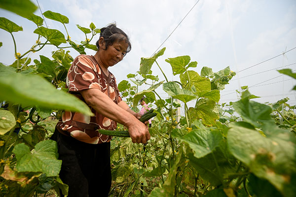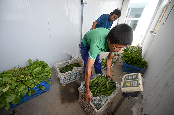 9月10日,工作人員在盛福源有機蔬菜種植基地採摘黃瓜。