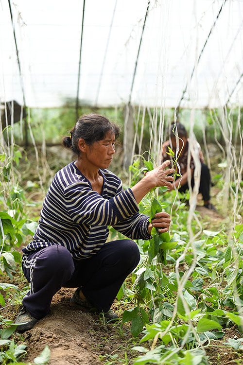 9月10日,工作人員在大棚里對有機豆角進行田間管理。