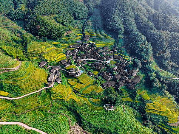 金秋時節,福建武夷山秋意盎然,金黃色的稻谷隨風舞動,一派豐收景象。