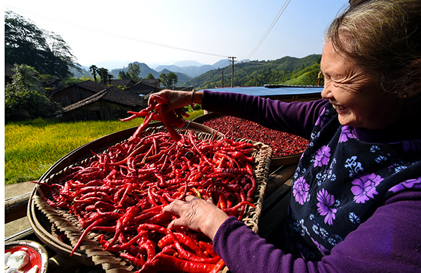 9月21日,武夷山市上梅鄉金竹村村民在家門前曬辣椒。