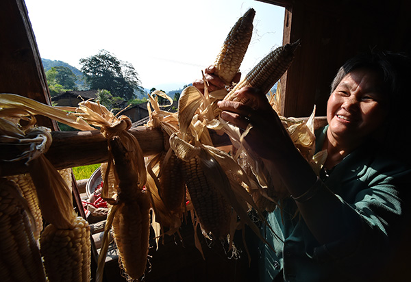 9月21日,武夷山市上梅鄉金竹村村民在家門前曬玉米。