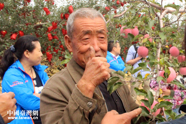 陜西省洛川縣洛陽村的陳成建老人對村里種植的蘋果讚不絕口。(中國臺灣網 張潔 攝)