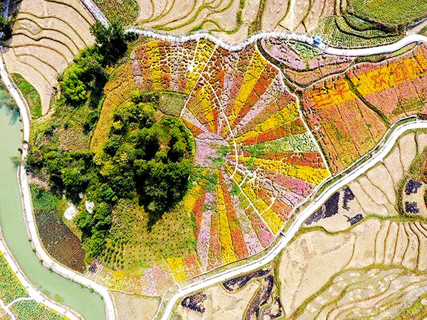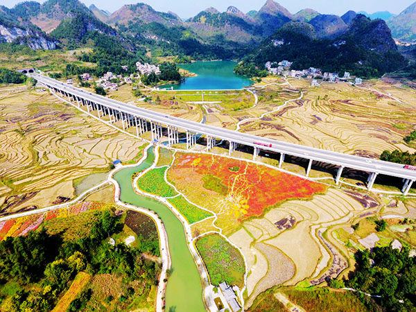 金秋時節,廣西河池市南丹縣巴平村梯田遍地金黃,五色鮮花點綴其間,美不勝收。