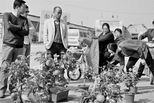 9月29日,原平市文殊莊村農民陳曉勇正在市場銷售盆栽蘋果,碩果累累的盆景倍受市民們青睞。他種植栽培的蘋果、葡萄、櫻桃等品種盆景,成為市場熱銷商品。目前,發展花卉觀賞農業已成為原平農民增收致富的有效途徑。