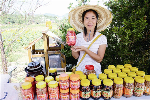 村民在旅遊節上展示自家做的紅糟酸。陳德仁/攝
