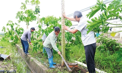 10月19日下午5時許,文昌市潭牛鎮中心村地氣蔬菜園產銷專業合作社,村民將被臺風刮倒的農作物扶起加固,抓緊災後生產恢復。