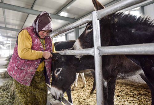 10月22日,在阿克陶縣精準扶貧農業科技產業示范基地內,來自蘇魯克村的熱曼古麗·克里木在喂養毛驢。