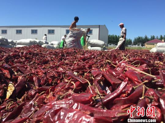 圖為當地農民正在將紅幹椒打包。
