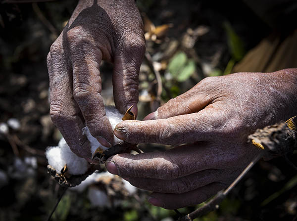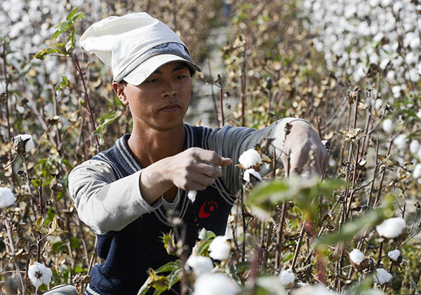 在新疆阿瓦提縣豐收三場的一處棉田里,來自重慶的何先培正在採摘長絨棉(10月24日攝)。