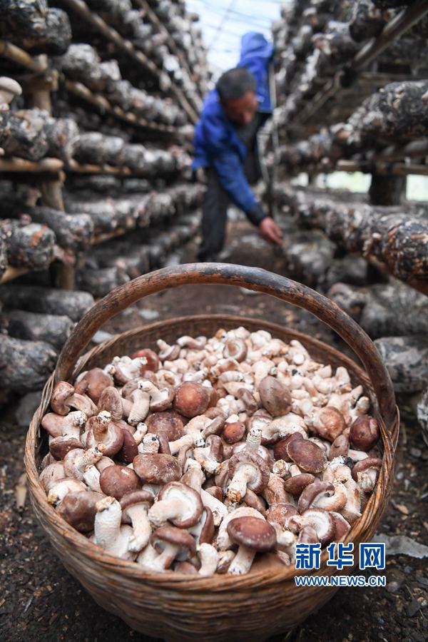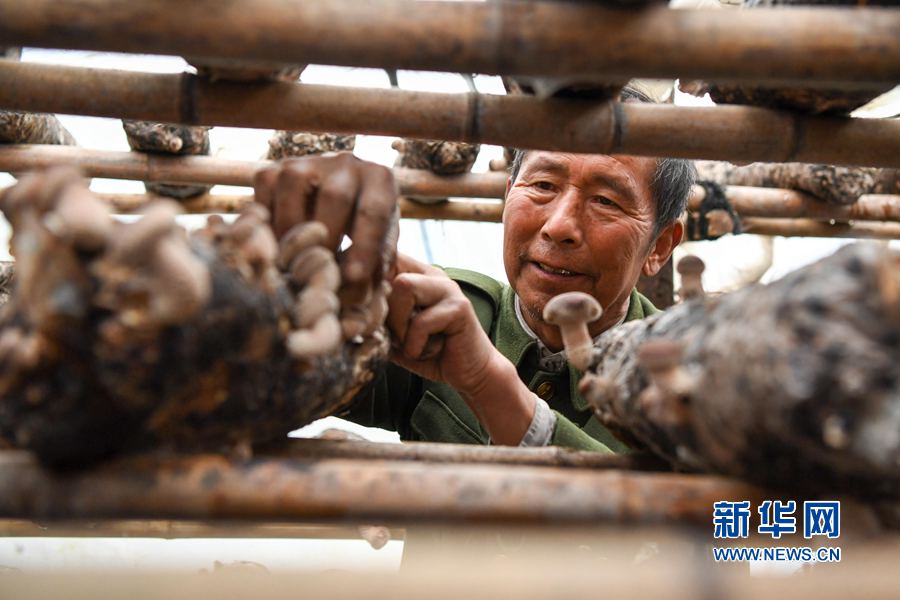 10月26日,河南省盧氏縣瓦窯溝鄉觀溝村農民在香菇棚內採香菇。