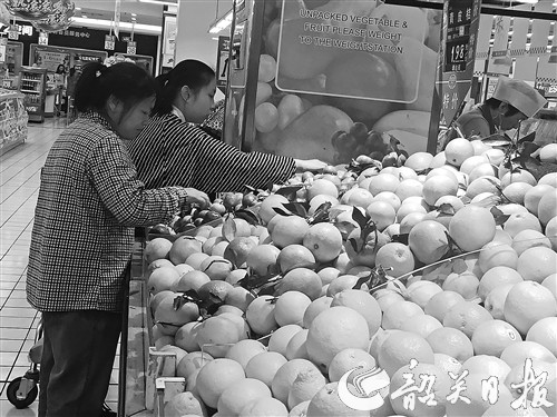 筆者在某大型超市看到,大量水果帶著新鮮的葉子被擺放在展臺上,標價牌上清楚地標示出南豐蜜桔6元/公斤、柿子10元/公斤、帶葉臍橙14元/公斤……工作人員剛打開一箱新鮮的青皮桔擺上展臺,數位市民立刻圍在展臺邊挑選,不一會兒,幾位市民的購物車里都多了一袋沉甸甸的青皮桔。