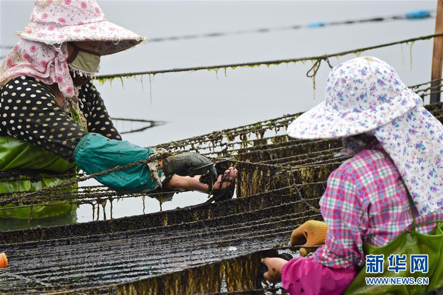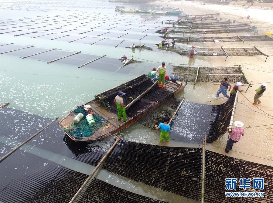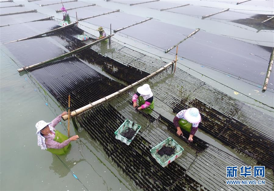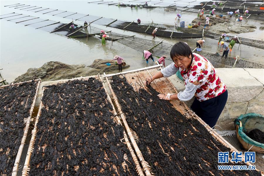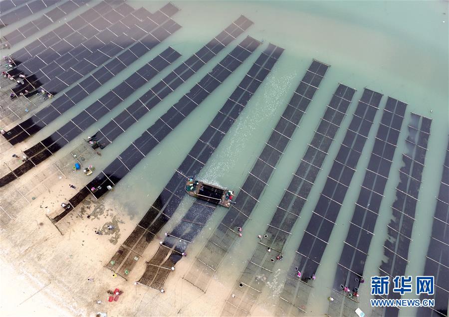 近日,福建省莆田市湄洲灣北岸蔣山村的3000畝養殖紫菜進入收割旺季,當地村民“全家總動員”,與海風潮汐、日出日落進行一場勞動競賽。近年來,面朝大海的蔣山村因地制宜發展海上紫菜種植,成為該村興家致富的主導產業。新華社記者姜克紅攝