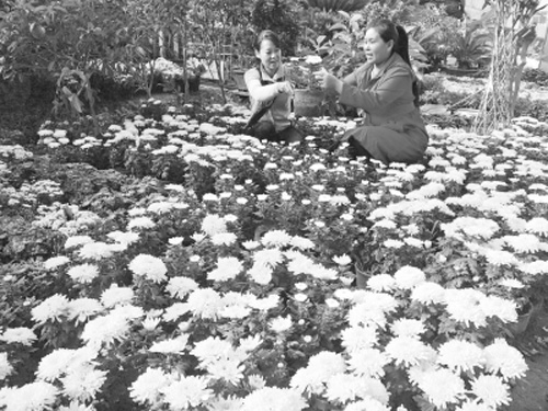 近年來,江蘇省東海縣農業資源開發局充分依托“中國花木之鄉”、“華東花都”和“國家地理保護產品百合”等優勢平臺,通過採取指導花農實施控制溫度、科學施肥等措施延長鮮切花、盆栽花卉的花期,大力發展“四季延時花卉”等100多個良種花卉種植,並合理利用日光大棚、溫室大棚和大田種植的模式,以其獨有的市場銷售份額,獲得倍增的良好經濟效益。圖為東海縣市民正在農業資源開發項目區農業園區選購“秋延菊”。