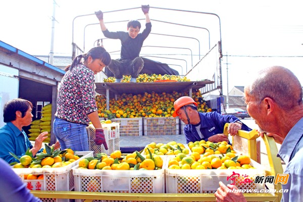 昨日上午,幾輛來自山東的卡車正在力洋鎮前橫村收購柑橘。