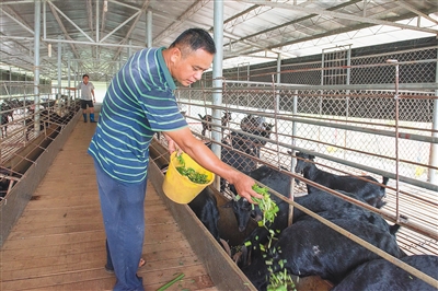 近日,在海口市瓊山區大坡鎮王峰種養專業合作社,貧困戶張運峰給羊喂草料。