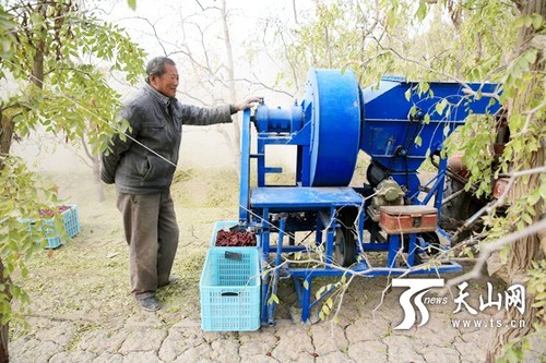 眼下,正值紅棗採摘時節,新疆若羌縣吾塔木鄉西塔提讓村棗農劉忠平每天都在棗園里忙得熱火朝天。不同于往年的是,他有了一個新的“法寶”——採棗“神器”。