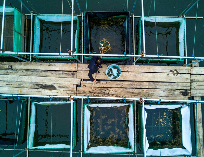 11月12日,洪橋鎮的一名養殖戶在打撈網箱中的河蟹準備銷售。