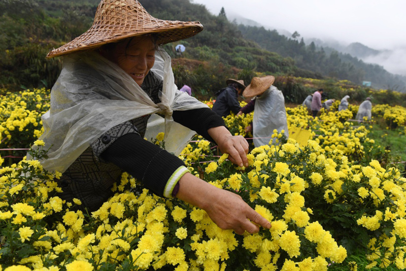 11月13日,江西省婺源縣浙源鄉察關村茶農在採摘有機皇菊。