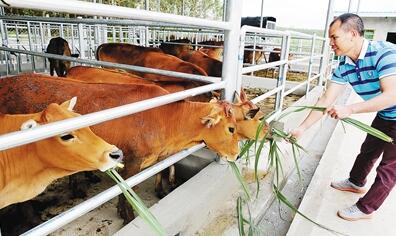 11月10日,白沙神鰲嶺野羊養殖專業合作社黃牛養殖基地的飼養員謝福前在給黃牛投放青飼料。