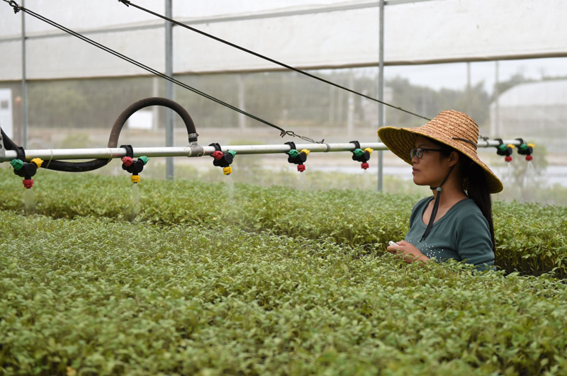 11月13日,南寧市興寧區五塘鎮一處蔬菜產業示范區的技術人員在控制機械噴淋菜苗。