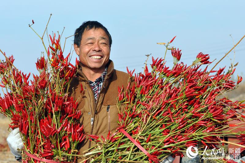 今年,該團種植戶劉成海種植的日本三櫻辣椒120多畝,以每畝430公斤地單產喜獲豐收。11日,湖北的辣椒商以每噸1.2萬元的價格收購了他剛剛炕幹的辣椒25噸。劉成海說:“以目前的價格銷售,今年辣椒純收入可達50萬元。”