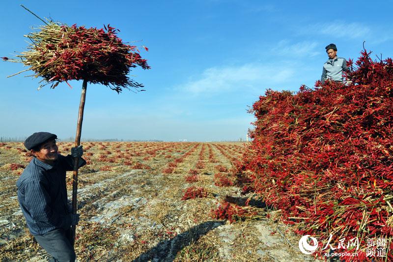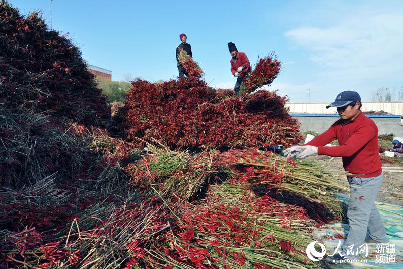 11月12日,新疆生產建設兵團八十九團尖椒種植戶劉成海將120畝割掉的辣椒裝車運到團部利用人工採摘、分揀和炕幹銷售。