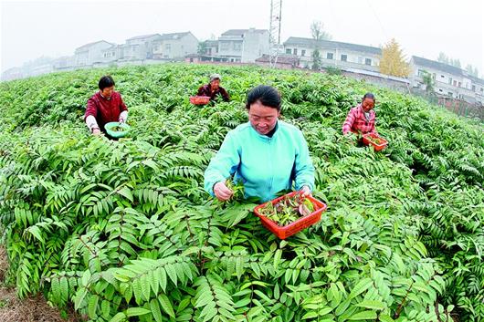 昨日,谷城縣城關鎮農民在綠尚農林種植示范基地採摘改良灌木香椿葉。該縣城關鎮引進白芨、黃精、白芍等中藥材種植,引導農民流轉土地3000多畝,帶動1855戶精準扶貧戶增收脫貧。