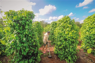在李布冠的胡椒地里,爬滿胡椒藤蔓的水泥桿排列得整整齊齊,“這些胡椒藤有3米長,至少生長了10年,之所以這麼茂盛得益于大坡良好的自然環境和鎮里的技術指導。”這位有著近20年胡椒種植經驗的老師傅自豪地告訴記者,“這幾年胡椒收購價不斷上漲,前兩年每斤的價格達50元以上,今年收獲2000多斤,除去成本,凈賺差不多5萬塊。”
