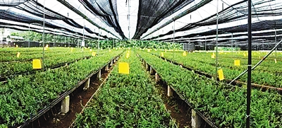 沿著儋州往昌江的225國道前行,在那大鎮雲月湖附近一片依山傍水的地方,你會看到一片黑色遮陽網大棚。走進大棚,一大片很少見的植物映入眼簾:細葉嫩莖,點綴著嫩黃的花朵,每一壟兩邊都立著黃色的塑料薄片,上面星星點點沾著各種小蟲。
