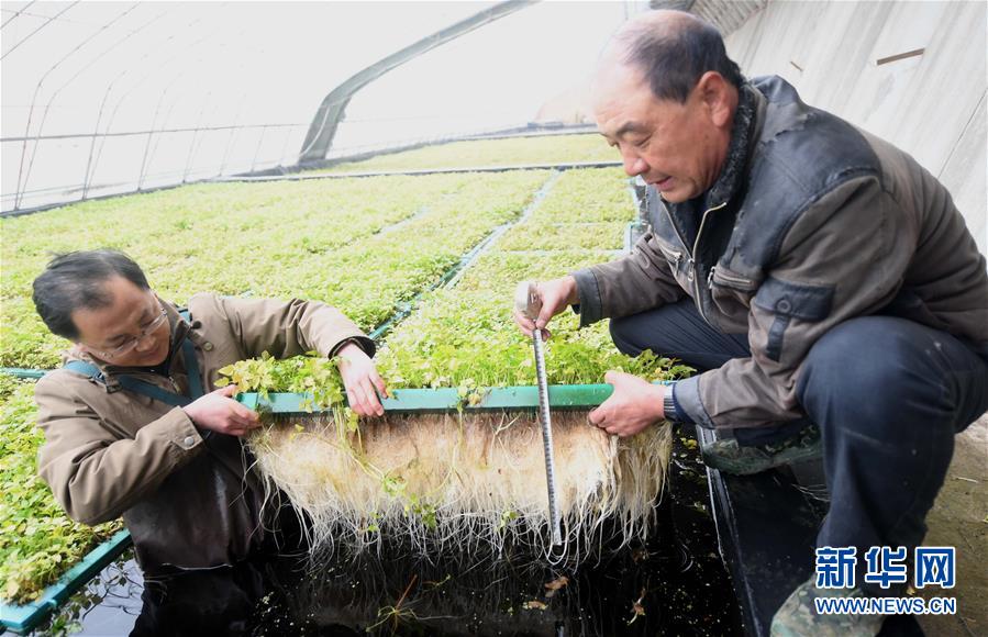 11月17日,河北省永清縣韓村鎮東營水體生態景觀農業科技園員工在查看“無土水芹”根係長勢。