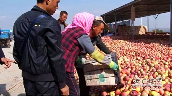 蘋果是靖遠縣三灘鎮的主導產業,隨著蘋果品牌的不斷推廣,優質的三灘蘋果不僅吸引了本地的商販,還引來了不少外地客商前來訂購。市場上,採摘下的蘋果堆成了小山,村民們正在有序的忙碌著,分揀蘋果裝箱。果農們開著三輪車,滿載著一筐筐紅彤彤的蘋果來到市場上,跟商販們商討價錢,一聲“過稱”,彼此達成協議成交。