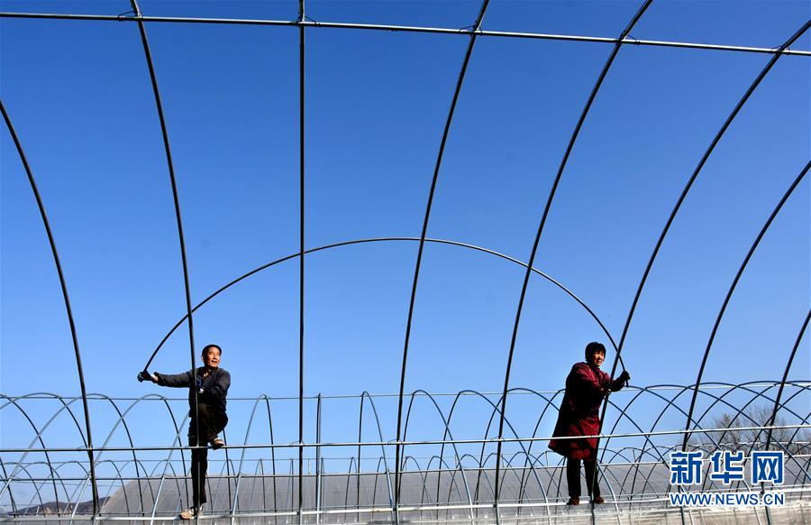 11月20日,山東省沂源縣石橋鎮馬莊村農民在搭建溫室大棚。