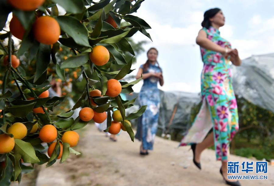 11月18日,在廣西融安縣大將鎮大將社區三馬屯,旗袍愛好者在桔園里進行旗袍走秀。