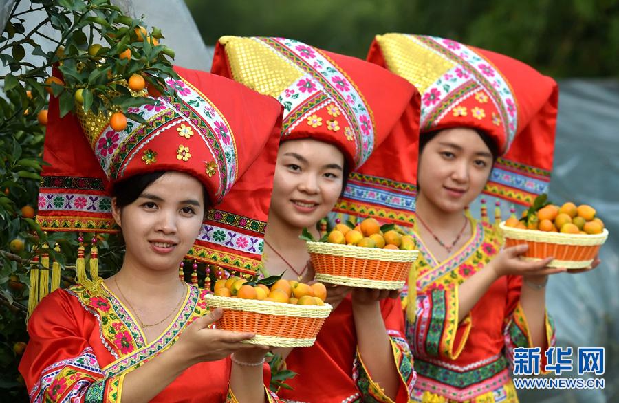 11月18日,在廣西融安縣大將鎮大將社區三馬屯,身著壯族服飾的姑娘展示金桔。