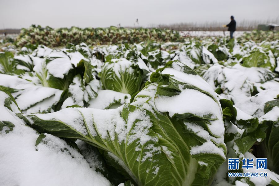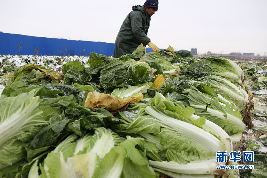 2016年11月22日,河南省民權縣綠洲辦事處睢洲壩村村民冒雪在復耕的土地上採摘大白菜。河南省民權縣綠洲辦事處睢洲壩村是鄭(州)徐(州)高鐵途經地,高鐵建成後,被徵用的部分耕地得以復耕,老百姓在上面種植蔬菜,頭年便獲得了較好的收成。