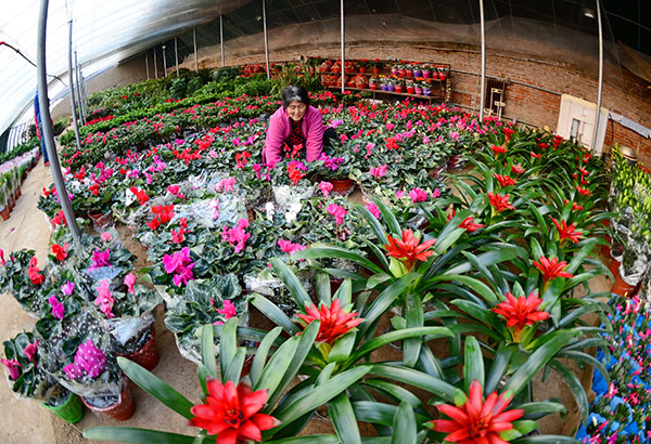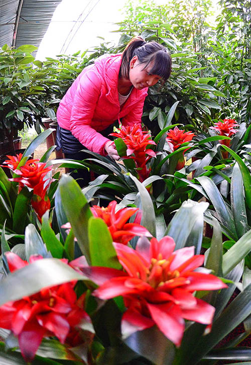 11月28日,河間市柳林村花農在溫室大棚內整理盆栽花卉。