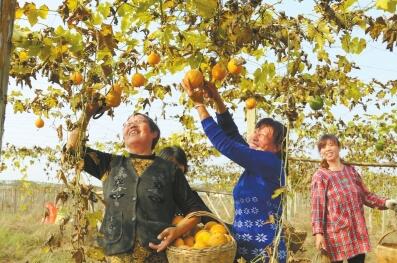 11月14日,河南省光山縣潑陂河鎮蔡圍孜村江威農業農民專業合作社農民在田間採摘瓜蔞。今年2月該合作社投資41萬元,從安徽省潛山縣引進野生瓜蔞苗1.6萬棵,種植面積84畝。瓜蔞籽每斤賣20多元,瓜蔞皮、根都是中藥材。今年合作社每畝創收3200元,純收入23萬多元,解決村里21名農民就業,幫扶當地16戶貧困戶脫貧致富。