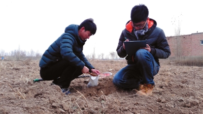寧夏國土資源調查監測院的工程師對土壤取樣。
