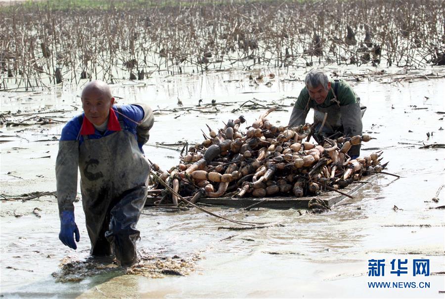 日前,江西省東鄉縣瑤圩鄉文溪村蓮藕產業扶貧示范基地的500畝花奇蓮蓮藕喜獲豐收。該基地採取“基地+貧困戶”模式進行示范種植,基地藕種目前已被全部訂購,畝產值達1萬多元。新華社發(何江華 攝)