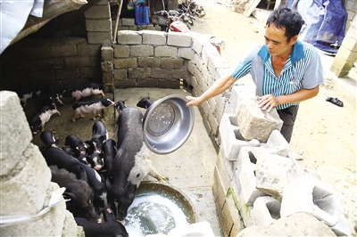 近日,在白沙黎族自治縣青松鄉青新村,五腳豬養殖戶王天章在給豬喂食。據了解,王天章是青新村的上門女婿,其岳父是村里的特困戶,王天章把養殖五腳豬的技術和管理經驗帶到村里來。目前,他修了5個豬圈,養了17頭豬,再過半年就可以帶來可觀的收入。