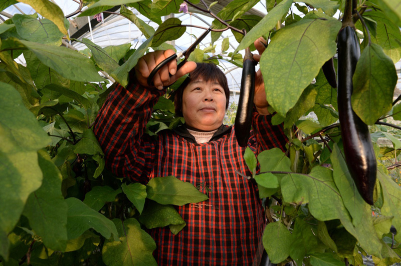 11月30日,江蘇省四星級鄉村旅遊景區——鹽城市大豐區豐收大地現代農業示范園員工在大棚內採摘蔬菜。
