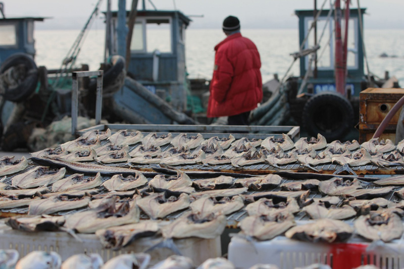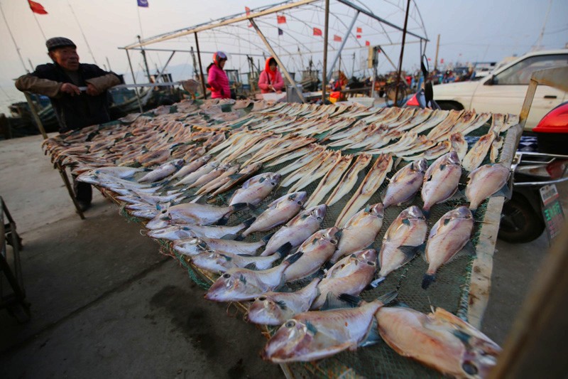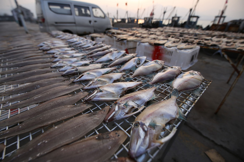 11月30日,漁民在青島嶗山區港東漁碼頭晾曬海魚。
