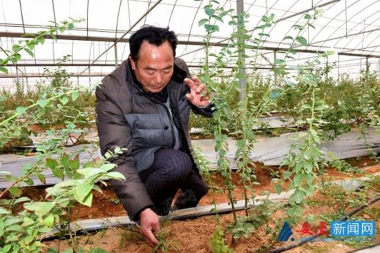 11月29日下午,黃墩鎮獨秀山腳下,放眼望去,一株株藍莓隨風搖曳。一處佔地30畝的四個大棚格外引人注目。盡管室外風大天冷,但走進大棚內,里面卻溫暖如春。