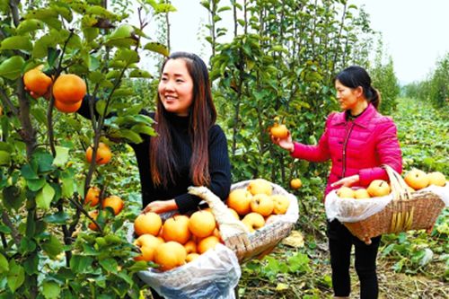 遊客在光山縣仙居鄉張灣村青春農藝農機專業合作社採摘晚秋黃梨。該合作社種植了280畝晚秋黃梨,今年純收入達160多萬元,帶動村里7戶貧困戶實現脫貧。