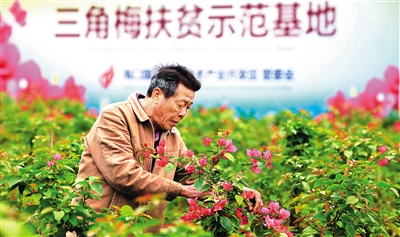 11月29日,在海口市雲龍鎮雲嶺村三角梅扶貧示范基地,貧困戶馮所發正在管理自家的三角梅盆景。