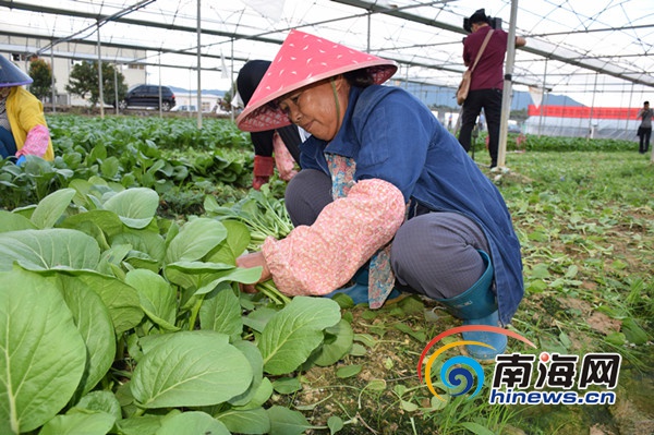 12月2日,三亞市天涯區過嶺村的常年蔬菜應急調控保障基地一派繁忙的景象,綠意盎然間彌漫著豐收的氣息,40多名工人正在採摘菜心、空心菜等,首批近萬斤蔬菜將運往市政府保基本蔬菜品種批發區,直接供給公益性攤位、市場和超市。